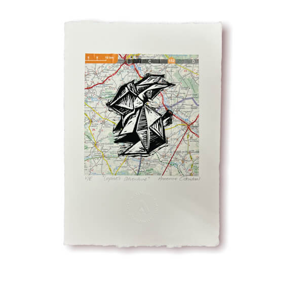 This series was done in my signature lino-cut medium. I draw the artwork onto linoleum, and then start to carve it out with my woodcutting tools – not without injury of course! Once this is completed, I ink the linoleum plate, and roll it through my trusted printer press. Once they dry, I hand paint each one individually, with some kind of camouflage motive.